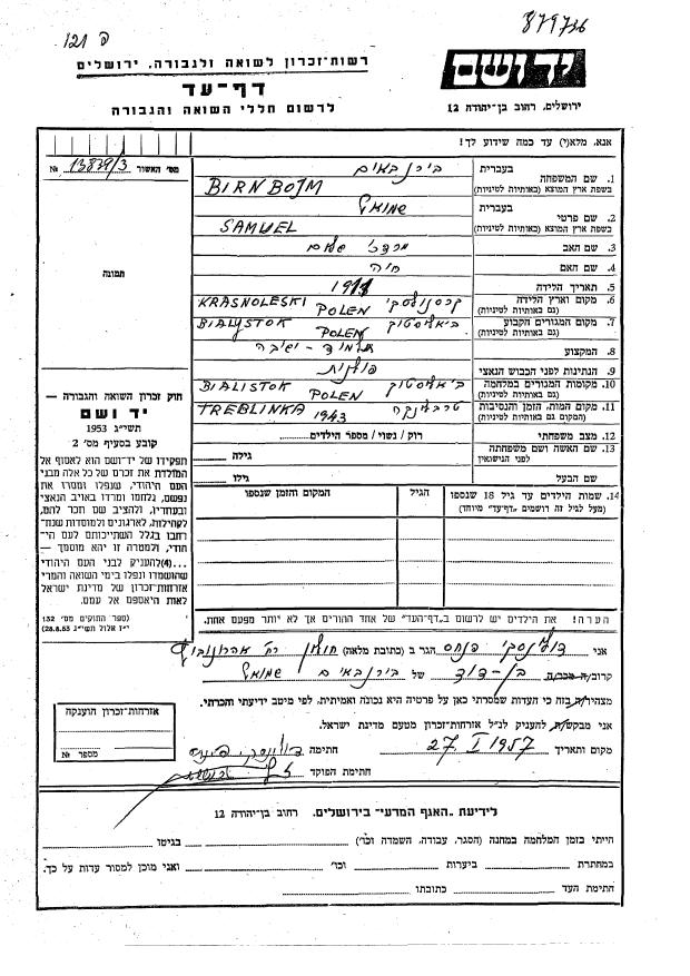 Samuel (Shmuel) Birnbojm Yad Vashem Page of Testimony 107